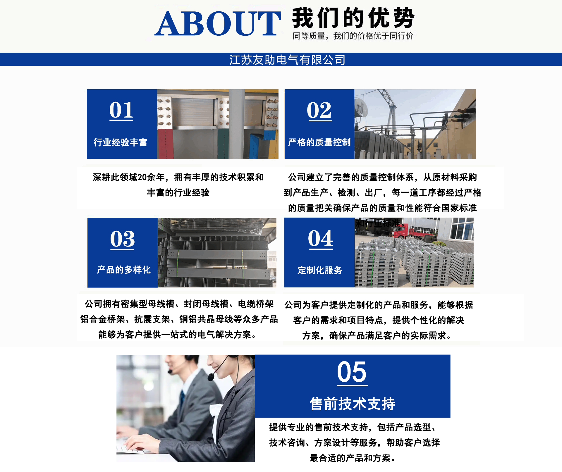 江蘇友助電氣有限公司地處中國工程電氣生產基地-一江蘇省揚中市。經營范圍:電纜橋架,母線槽(橋),管型母線,銅軟連接(伸縮節),高低壓開關柜,配電箱,抗震支架產品系列。 公司宗旨:客戶至上。已成功為江蘇二十屆省運會會場-泰州體育館,南京寶龍商業綜合體,張家口百兆瓦風電場,濟源市婦幼醫院,威海市未來科技園,湖北皇恩燁新材料科技有限公司,南京中央路小學,南通中天大酒店,新疆新安特鋼有限公司,河北省送變電有限公司,南京南微醫學研發基地等多項工程配套服務,我們愿與您精誠合作,互利共贏!公司技術人員深耕橋架,母線領域30年,為您提供橋架,母線槽疑難問題解決方案。母線槽不論每相是單排,雙排,三根排重疊,不管有多少個水平彎、垂直彎,轉接排在發貨前預裝一遍,確保尺寸無誤。到現場直接擰螺絲,效率高,橫平豎直,規規矩矩,符合標準,供電局,業主,監理,驗收易通過。供貨周期3-7天。為了讓尊貴客戶您,設備安全通電,高枕無憂。我們提供如下售前售中售后服務: 售前:免費技術支持,咨詢。 售中:免費現場精確測繪、設計。 售后:安裝服務,免費指導。 質量是生命,客戶是源泉。承諾客戶的,一定全力做到。讓我們一起進步!...